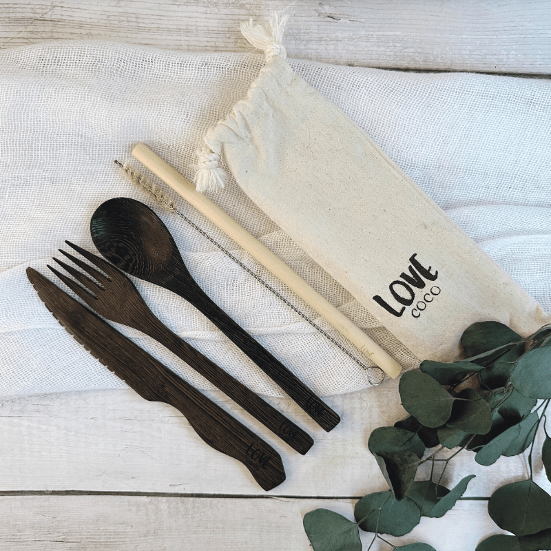 Cuttlery pouch with Knife, Fork, Spoon, Straw and white starw brush cleaner